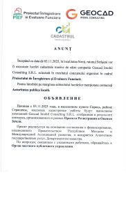 Începând cu data de 03.11.2025, în localitatea Sireti, raionul Strășeni vor fi executate lucrări cadastrale masive de către compania Geocad Imobil Consulting S.R.L. selectată în rezultatul concursului organizat în cadrul Proiectului de Inregistrare si Evaluare Funciară. Pentru întrebări pe marginea subiectului lucrărilor menționate contactati Autoritatea publica locală.
